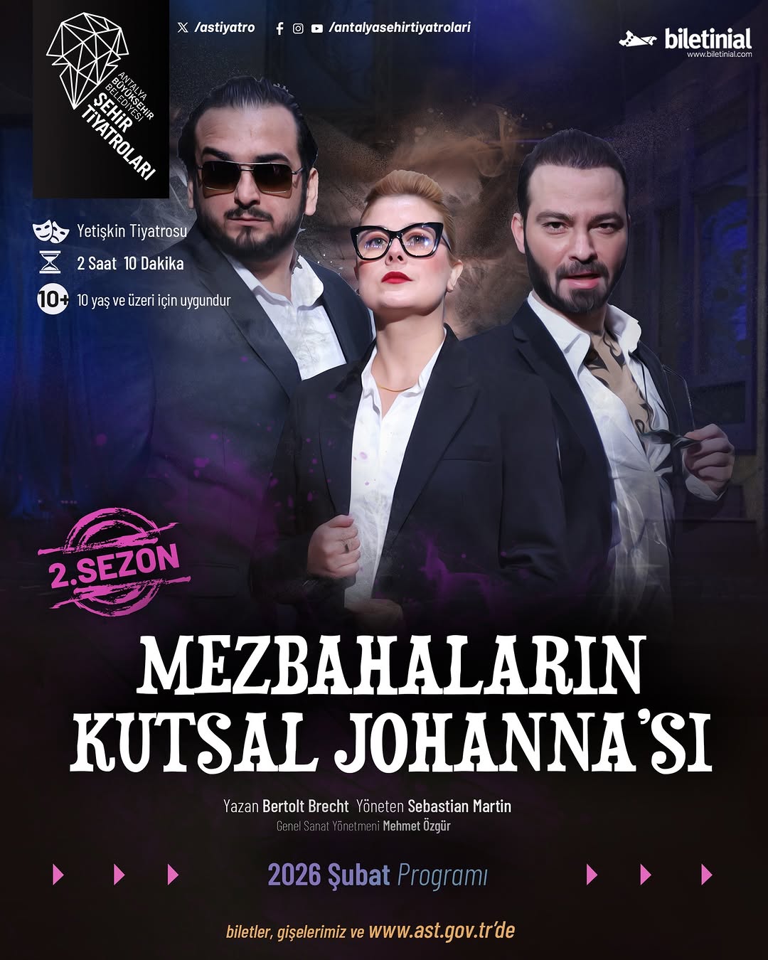Antalya Büyükşehir Belediyesi Şehir Tiyatroları, tiyatro dünyasının önemli isimlerinden Bertolt Brecht'in unutulmaz eseri "Mezbahaların Kutsal Johannası" ile Şubat ayında seyirci karşısına çıkıyor. Oyun, biletlerin satışa sunulmasıyla birlikte tiyatroseverlerden büyük ilgi görüyor.