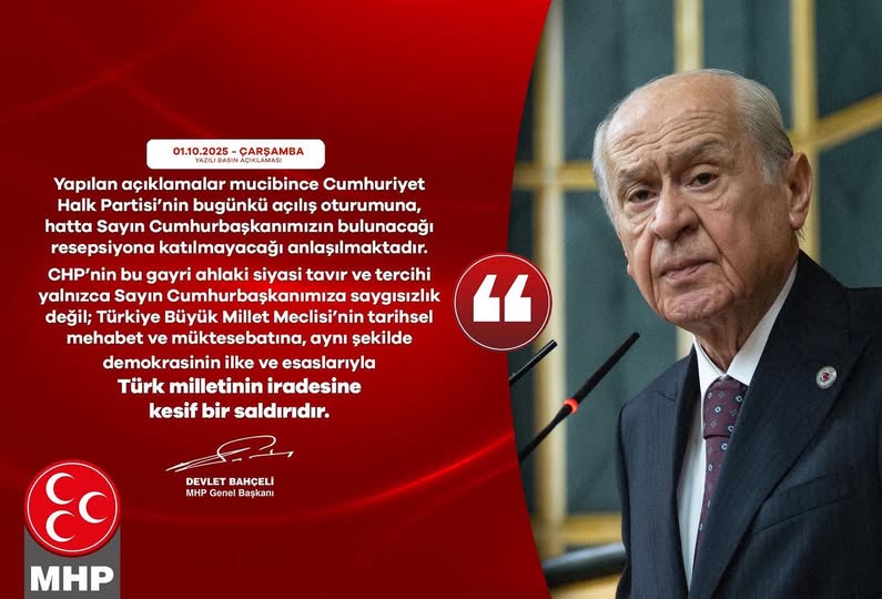 Milliyetçi Hareket Partisi (MHP) Antalya İl Başkanlığı, Cumhuriyet Halk Partisi'nin (CHP) Türkiye Büyük Millet Meclisi'nin açılış oturumu ve Cumhurbaşkanı'nın katılacağı resepsiyona katılmayacağını açıklamasına sert bir tepki gösterdi. MHP, bu kararı ahlaksız bir siyasi tavır olarak nitelendirdi.