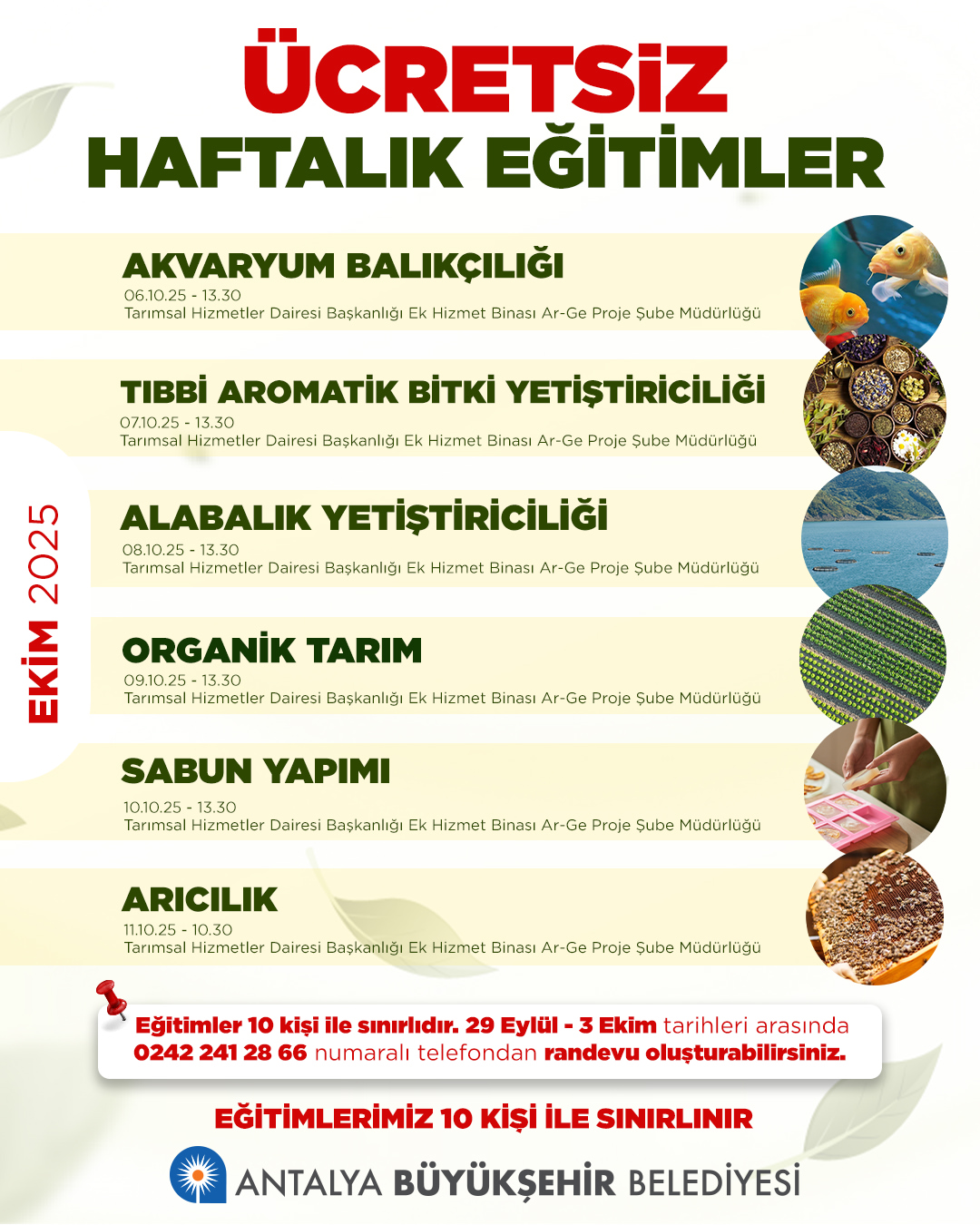 - 11 Ekim 2025 tarihleri arasında gerçekleştirilecek eğitimlerde katılımcılar, birbirinden farklı ve kazançlı tarım alanlarında uzmanlaşma fırsatı bulacak. Eğitim programı şu şekilde: