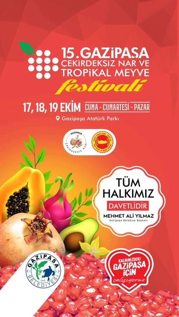 Gazipaşa Belediyesi tarafından bu yıl 15'incisi düzenlenecek olan Çekirdeksiz Nar ve Tropikal Meyve Festivali, 17 Ekim'de başlıyor. Festival, üç gün boyunca ilçenin renkli ve lezzetli dünyasını ziyaretçilerle buluşturacak.