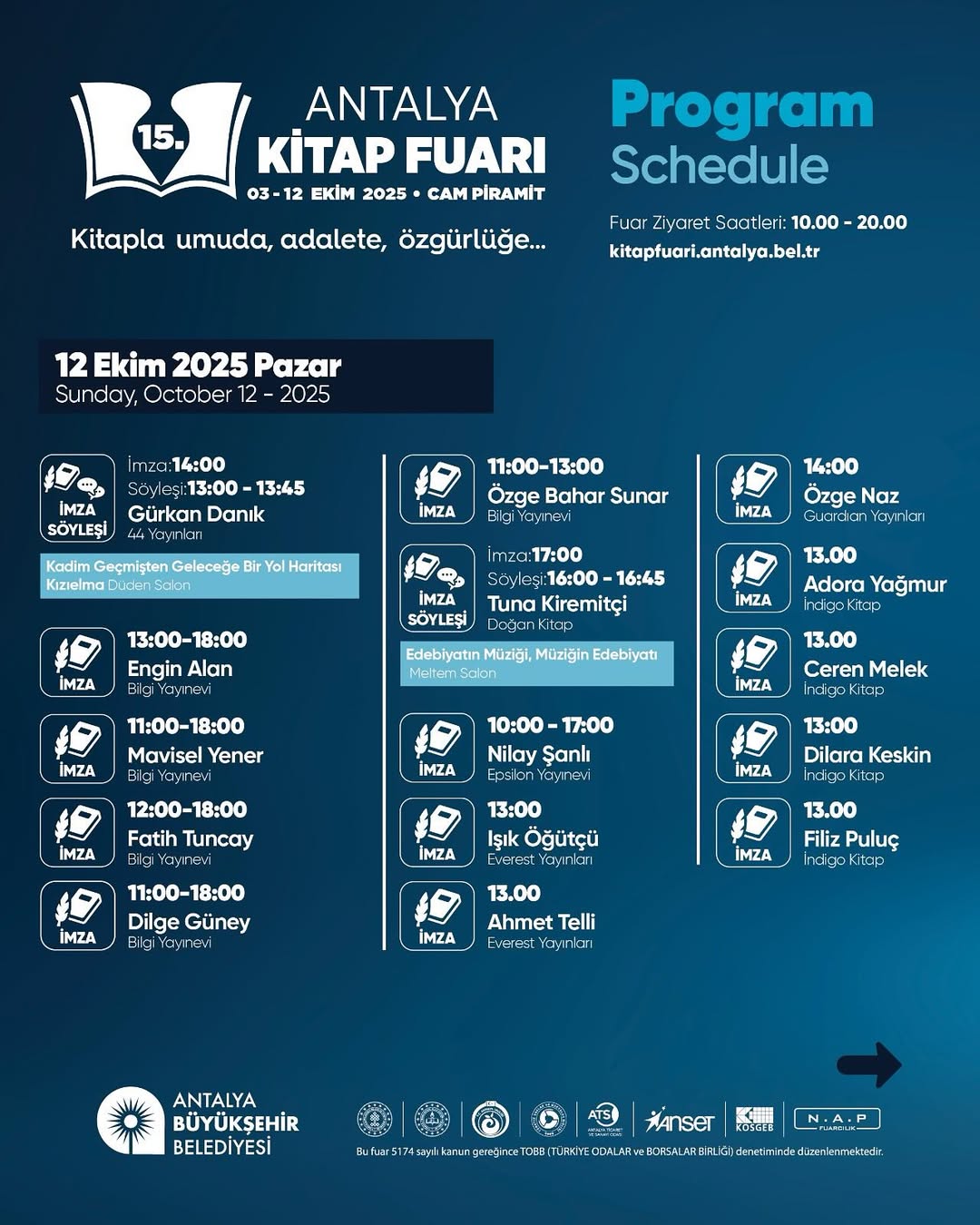 Antalya Kitap Fuarı, 12 Ekim Cumartesi günü düzenlenen etkinliklerle sona erdi. Cam Piramit Fuar ve Kongre Merkezi'nde gerçekleşen fuarın son günü, yazar imza günleri ve söyleşilerle dopdolu geçti.