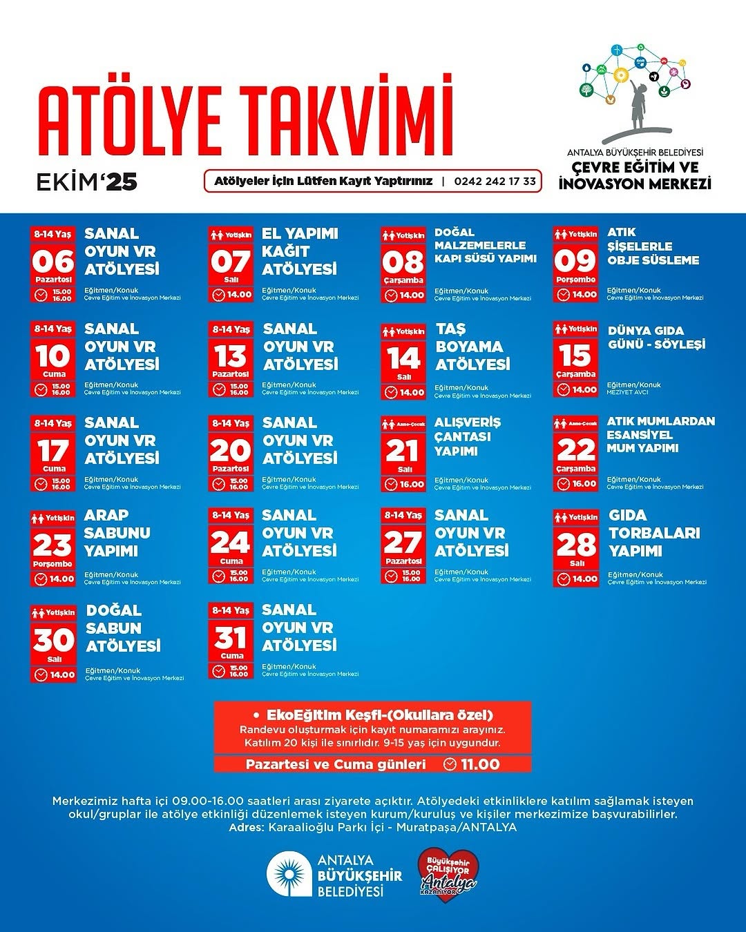 Tüm etkinlikler, Antalya'nın merkezinde bulunan Karaalioğlu Parkı içindeki Çevre Eğitim ve İnovasyon Merkezi'nde düzenlenecek. Ücretsiz olan bu etkinliklere katılmak isteyenlerin 0242 242 17 33 numaralı telefondan kayıt yaptırması gerekiyor. Kontenjanın sınırlı olduğu belirtilirken, eğitici ve yaratıcı içeriklerle dolu dolu bir ay vadediliyor.
