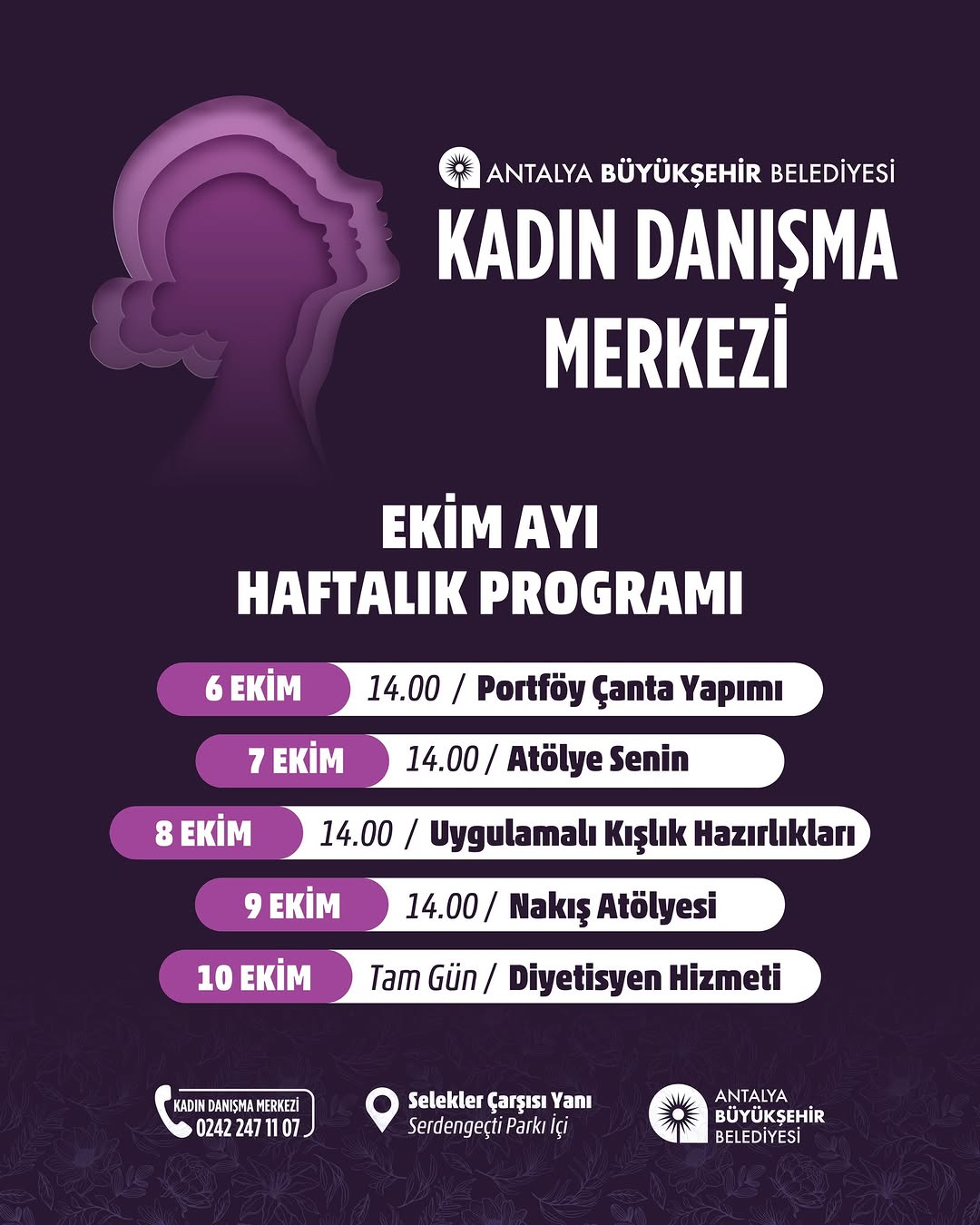 Kadınlara yönelik bu ücretsiz hizmetlerden yararlanmak isteyenler, Selekler Çarşısı yanındaki Serdengeçti Parkı içinde yer alan merkeze başvurabilir. Detaylı bilgi ve kayıt için 0242 247 11 07 numaralı telefon üzerinden iletişime geçilebiliyor.