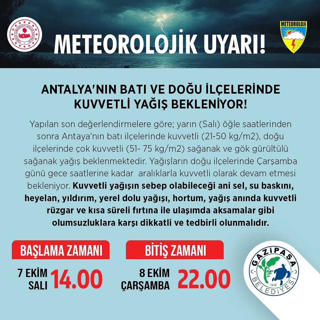 Gazipaşa Belediyesi, Meteoroloji Genel Müdürlüğü'nün değerlendirmelerine dayanarak Antalya için önemli bir meteorolojik uyarı yayınladı. Yarın (Salı) öğle saatlerinden itibaren başlaması beklenen kuvvetli sağanak ve gök gürültülü sağanak yağışların, özellikle doğu ilçelerini etkileyeceği bildirildi.