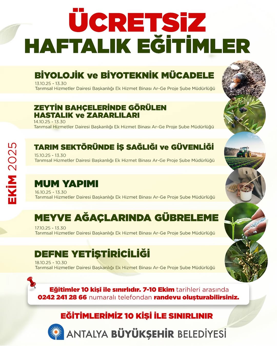 - 10 Ekim 2025 tarihleri arasında 0242 241 28 66 numaralı telefonu arayarak randevu oluşturmaları gerekiyor. Bu uygulama, eğitimlerin verimli geçmesi ve katılımcıların kaliteli bir eğitim alması amacıyla hayata geçiriliyor.