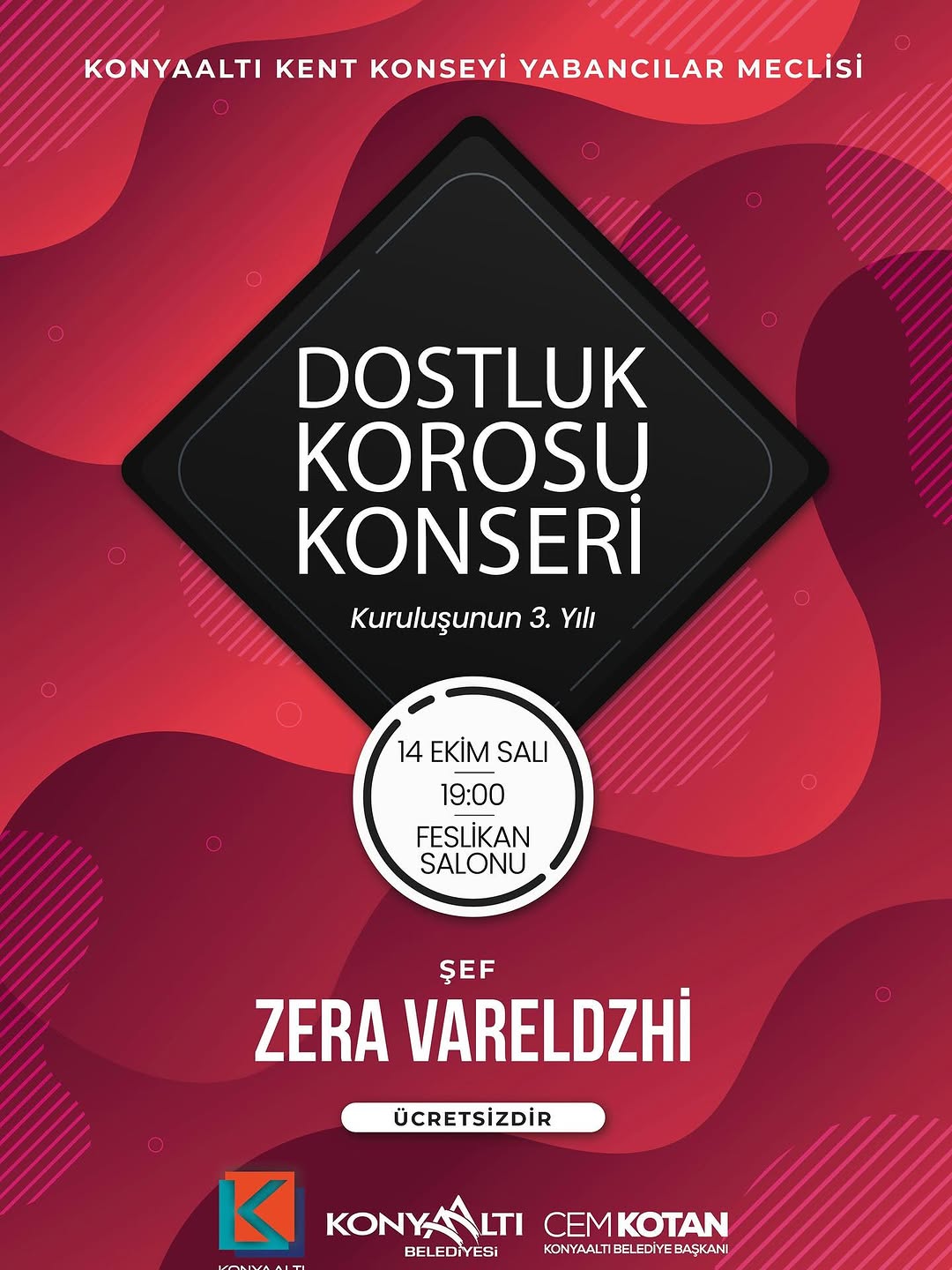 Müzikal dostluk buluşması, 14 Ekim Salı günü saat 19:00'da başlayacak. Konser için adres ise Konyaaltı Belediyesi Ana Hizmet Binası'ndaki Feslikan Salonu olarak belirlendi.
