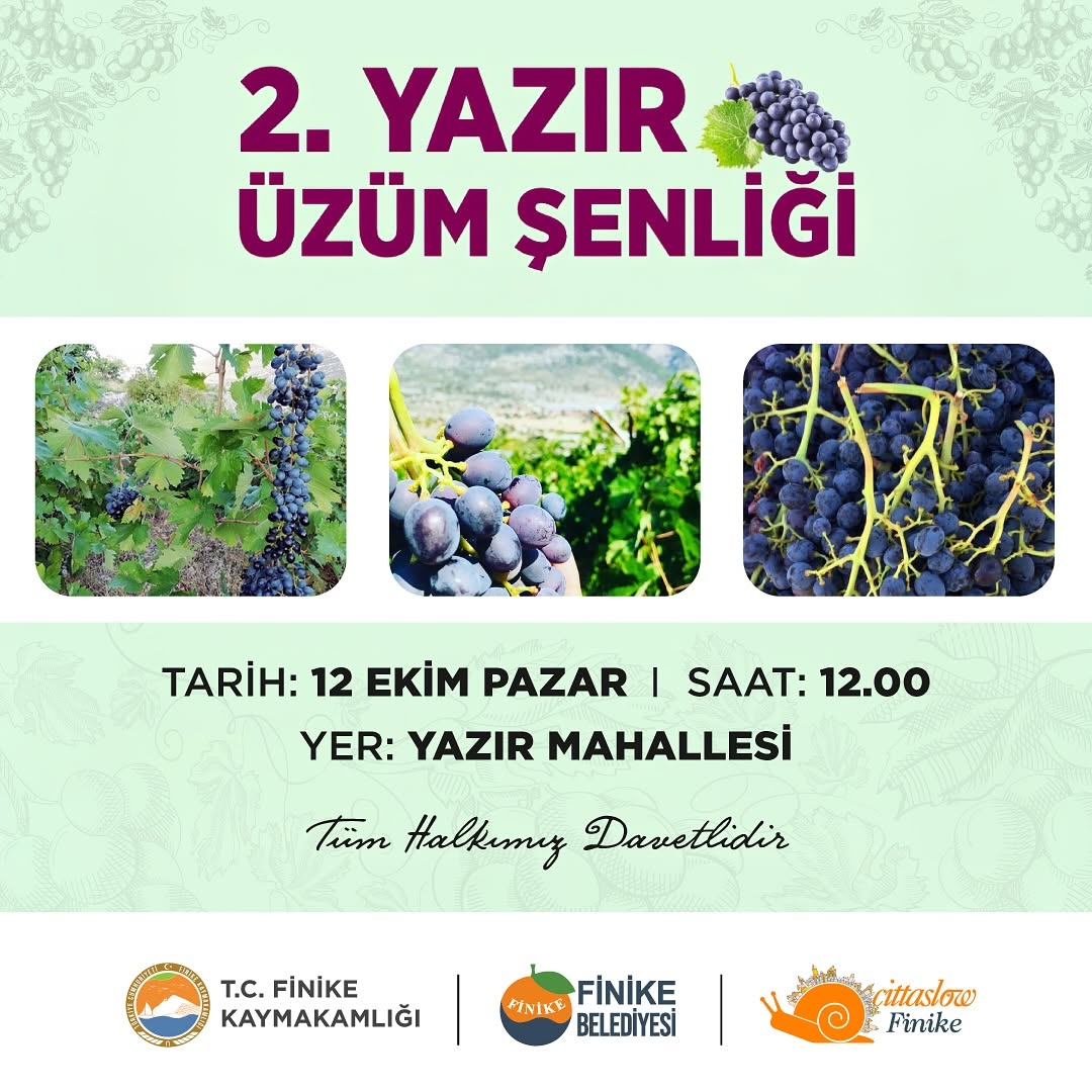 Finike Belediyesi tarafından bu yıl ikincisi düzenlenecek olan Yazır Üzüm Şenliği, coşkulu bir buluşmaya ev sahipliği yapacak. Şenlik, Yazır Mahallesi'ni renklendirecek birbirinden eğlenceli etkinliklerle halkı bir araya getirecek.