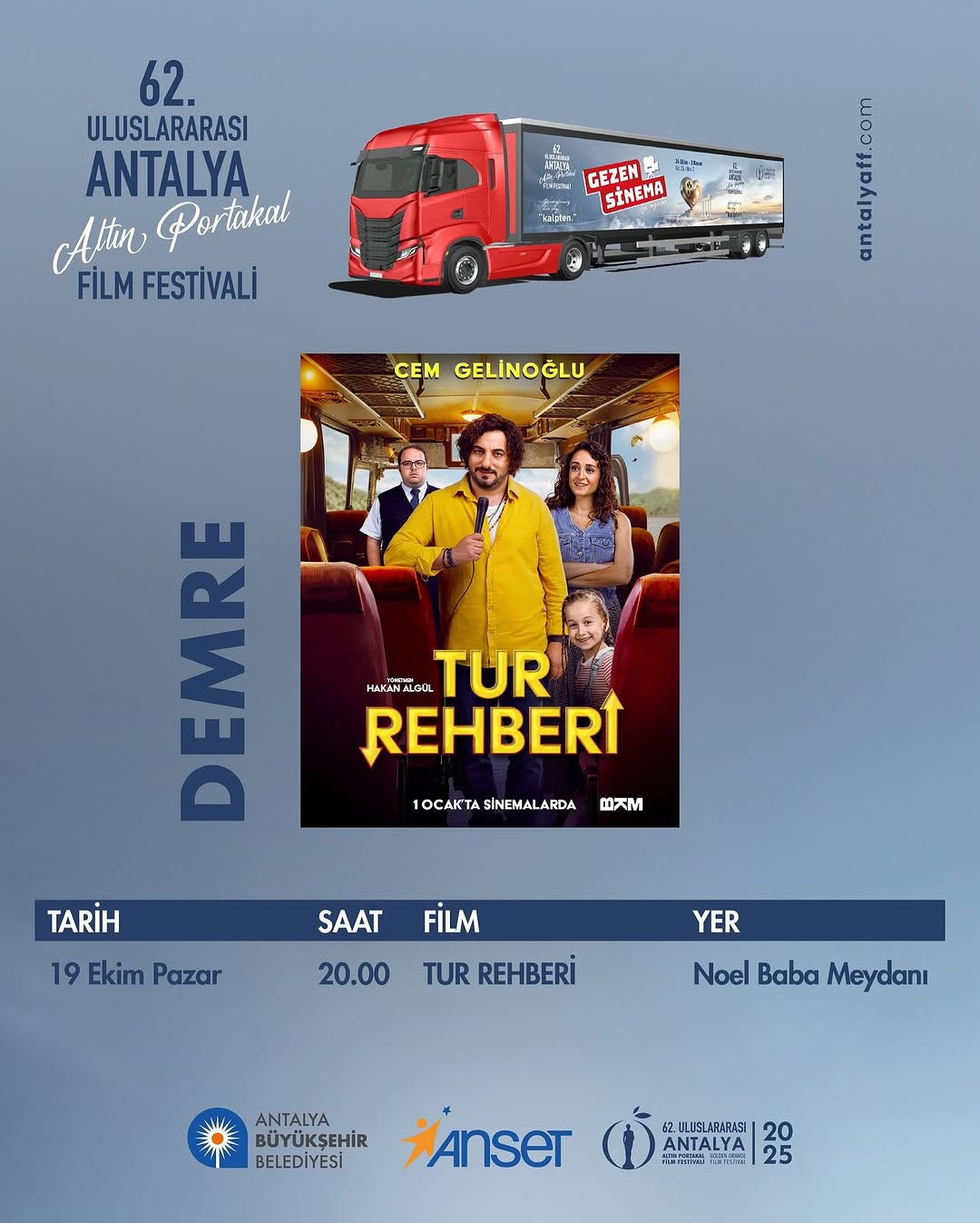 62. Uluslararası Antalya Altın Portakal Film Festivali kapsamında düzenlenen "Gezen Sinema" etkinliği, bu kez Demreli sinemaseverlerle buluşmaya hazırlanıyor. Antalya Büyükşehir Belediyesi organizasyonuyla ilçeye gelecek olan etkinlik, ücretsiz olarak gerçekleştirilecek.