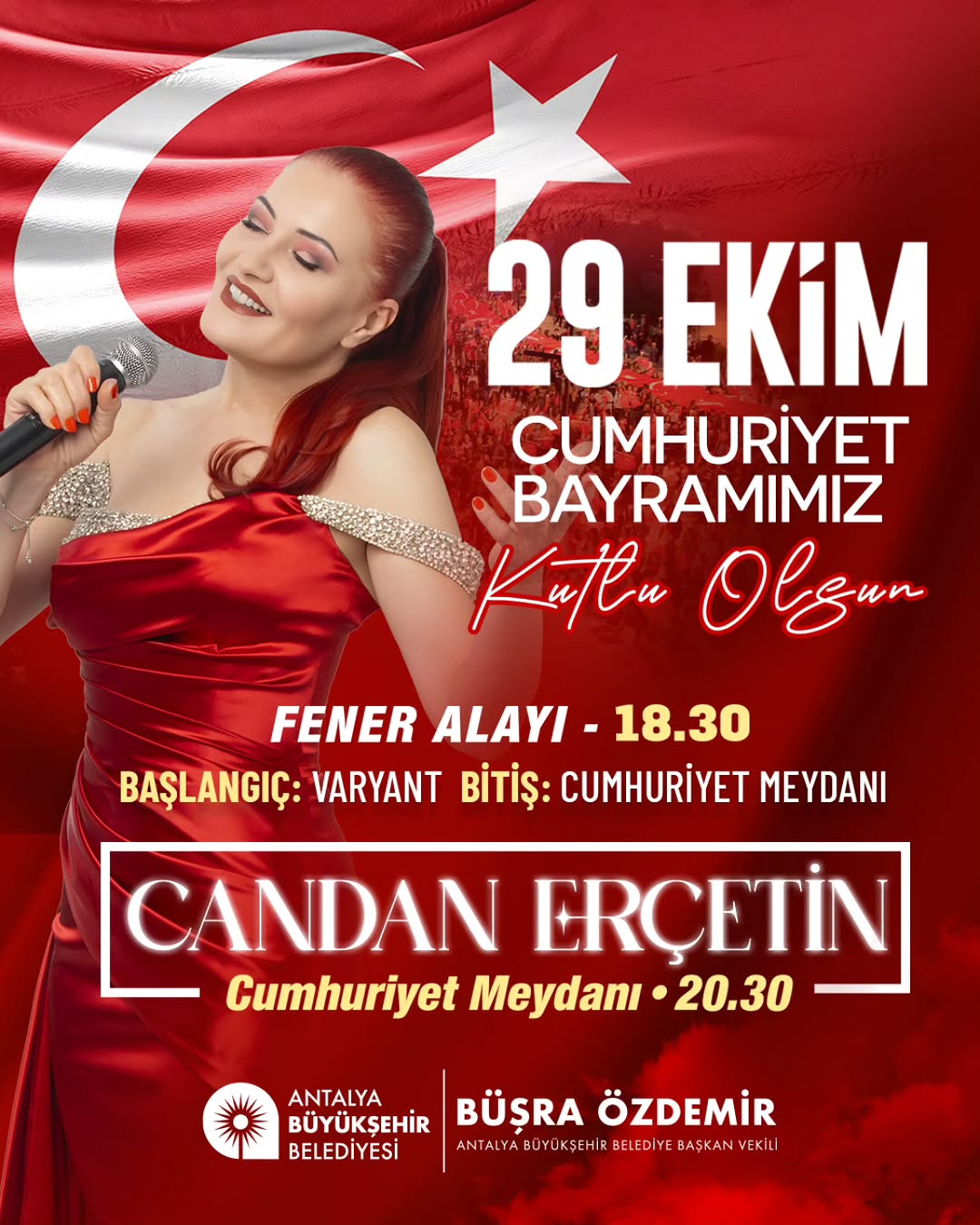 Fener alayının ardından, saat 20:30'da Cumhuriyet Meydanı'nda sevilen sanatçı Candan Erçetin bir konser verecek. Erçetin, seslendireceği unutulmaz şarkılarıyla 29 Ekim coşkusuna müzikle eşlik edecek. Konser, kutlamalara renk katacak ve her yaştan Antalyalı için unutulmaz bir anı olacak.