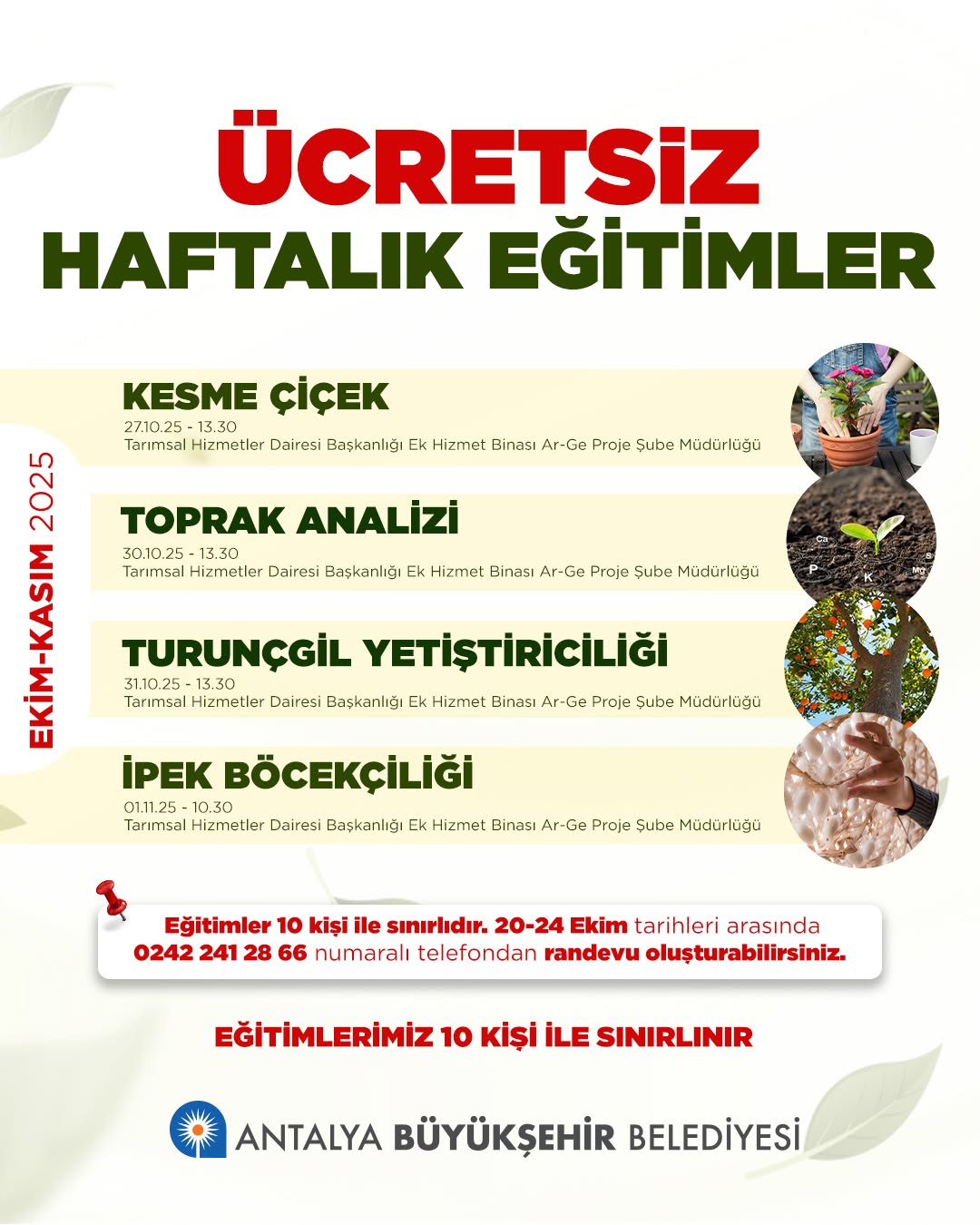 Antalya Büyükşehir Belediyesi, kentteki çiftçilerin ve tarıma ilgi duyan vatandaşların bilgi ve becerilerini artırmak amacıyla bir dizi ücretsiz eğitim programı düzenliyor. Kesme çiçek, toprak analizi, turunçgil yetiştiriciliği ve ipek böcekçiliği gibi önemli başlıkları kapsayan eğitimler, Ekim ve Kasım aylarında gerçekleştirilecek.