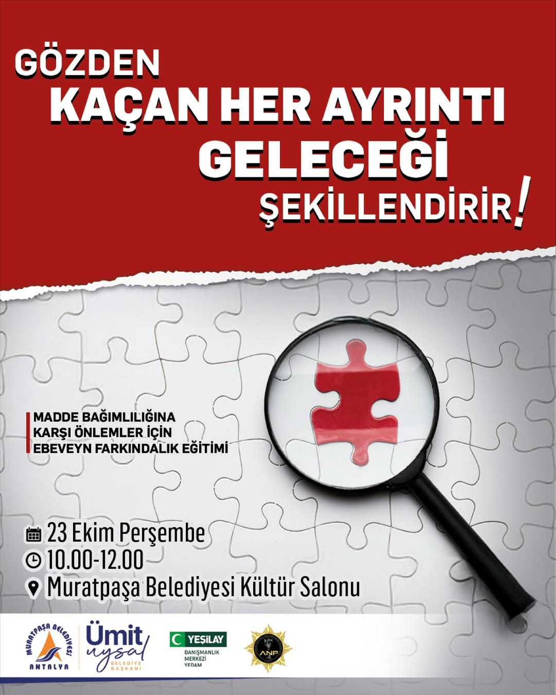 Antalya'nın Muratpaşa Belediyesi, madde bağımlılığı ile mücadelede aileleri bilinçlendirmek amacıyla önemli bir farkındalık eğitimi düzenliyor. Eğitim, 23 Ekim Perşembe günü gerçekleştirilecek.