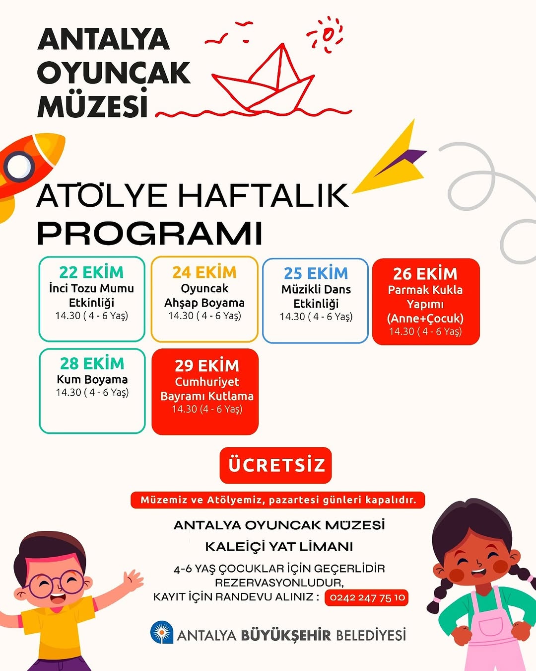 - 29 Ekim 2025 tarihleri arasında düzenleyeceği birbirinden renkli ve eğitici etkinliklerle çocukların buluşma noktası olmaya hazırlanıyor. Kaleiçi Yat Limanı'nda bulunan müze, tüm etkinliklere ücretsiz olarak katılım imkanı sunuyor.