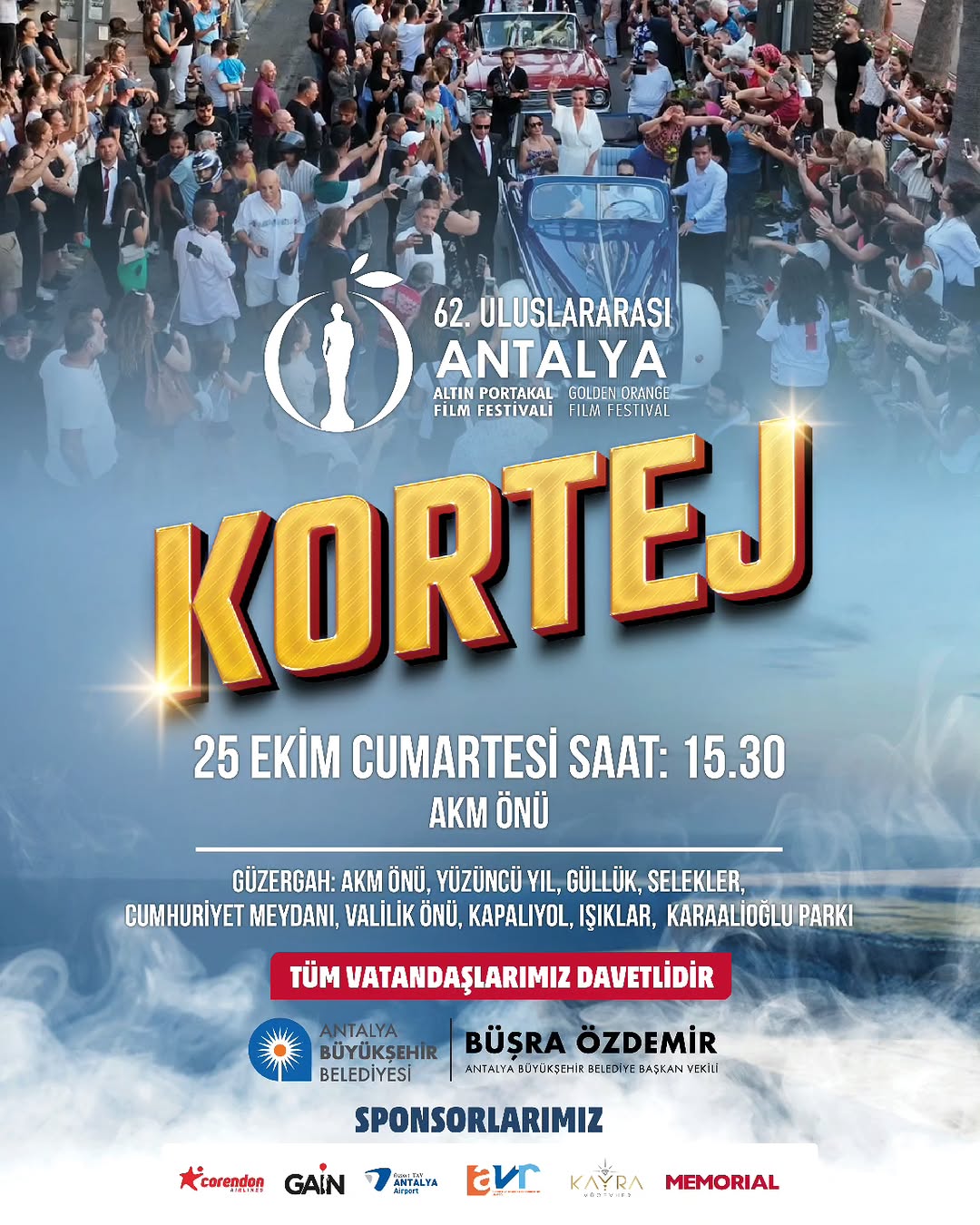 Sinema dünyasının önemli buluşmalarından biri olan Uluslararası Antalya Altın Portakal Film Festivali, 62. kez düzenlenecek geleneksel kortej yürüyüşü ile start alacak. Festivalin açılış ritüeli olan kortej, sanatçılar ve sinemaseverleri bir araya getirecek.