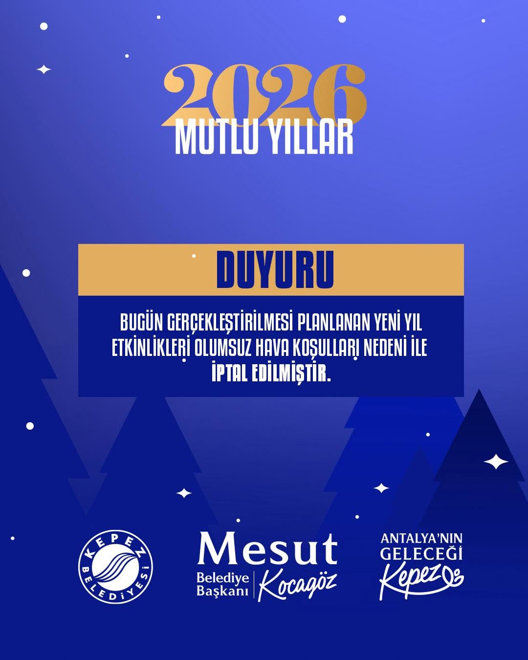 Antalya'nın Kepez ilçesinde, bugün yapılması planlanan Görkem Durmaz konseri ve yeni yıl kutlama etkinlikleri, beklenen olumsuz hava koşulları nedeniyle ertelendi. Belediye, etkinliklerin yeni tarihinin daha sonra açıklanacağını duyurdu.