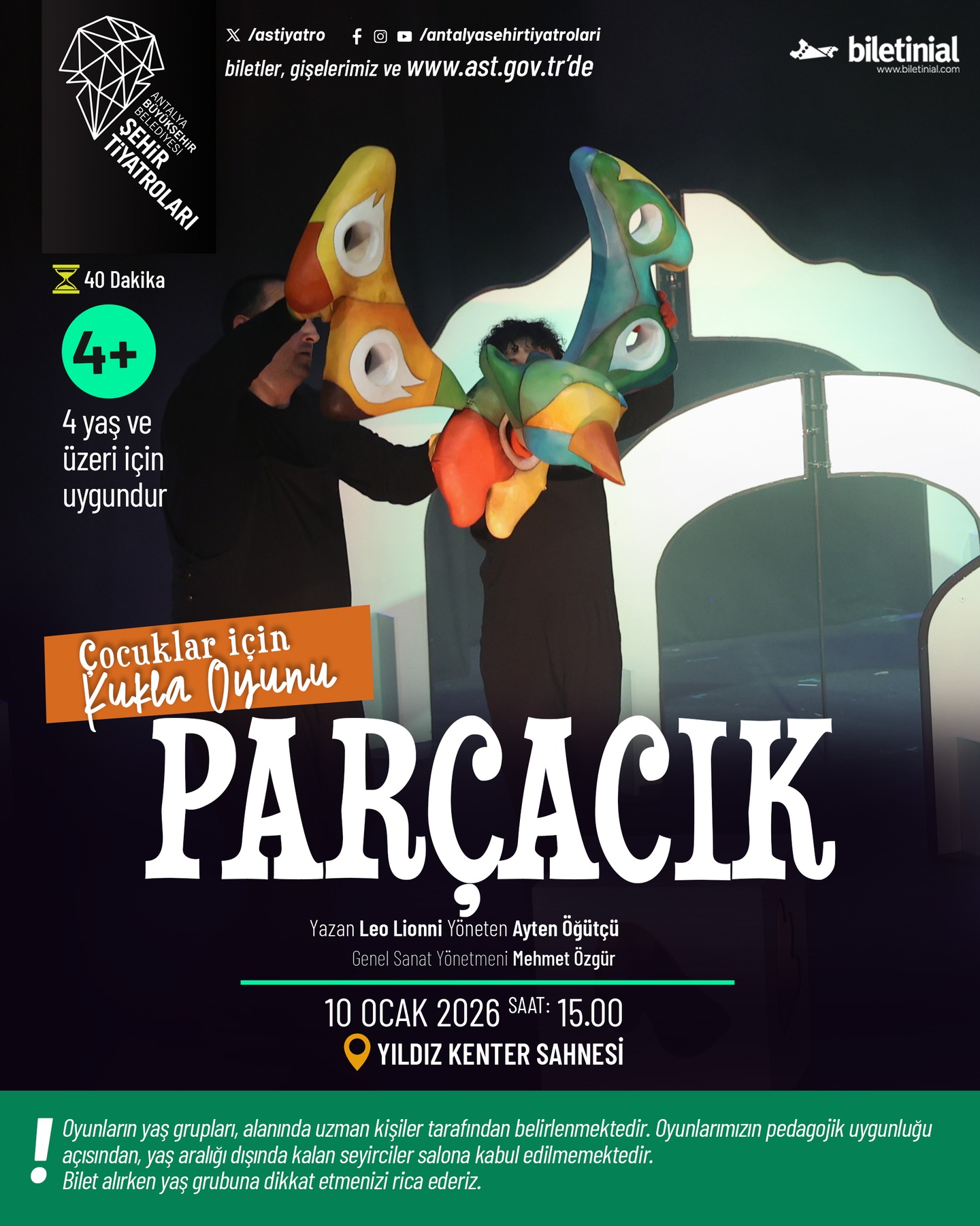 Oyunun biletleri, Antalya Şehir Tiyatroları gişelerinden ve resmi internet sitesi www.ast.gov.tr üzerinden temin edilebiliyor. Ayrıca, "biletinial" sorgusu yapılarak online bilet satış platformlarına da ulaşılabilir.