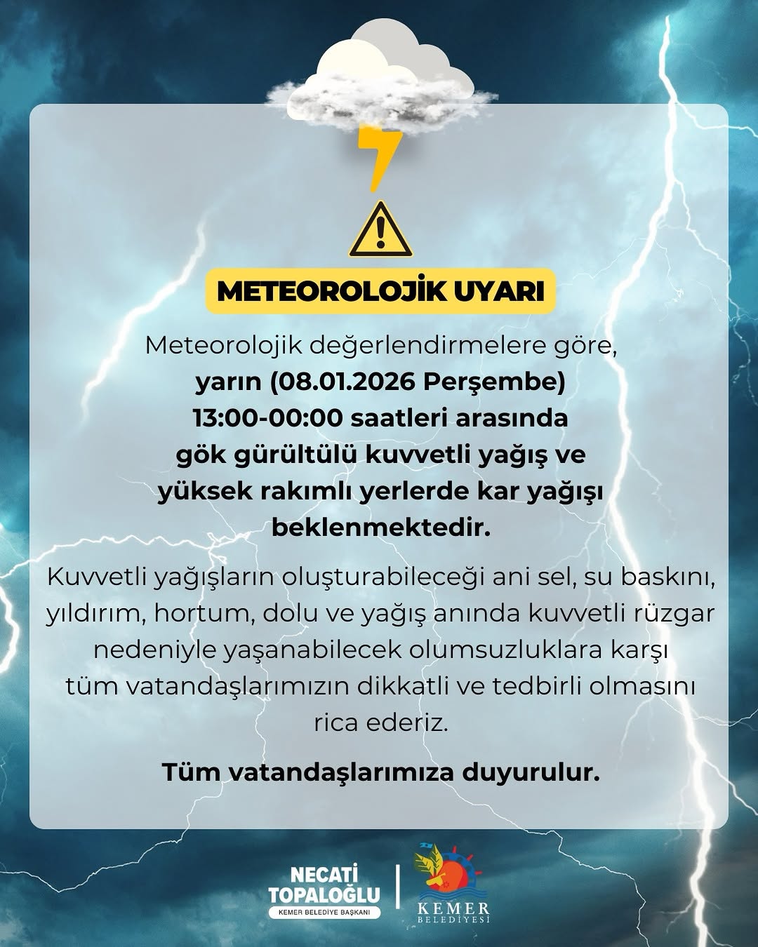 Bölge sakinleri, resmi kurumlardan gelecek olan anlık hava durumu uyarılarını takip etmeye ve olası bir acil durumda 112 Acil Çağrı Merkezi'ni aramaya davet edildi.