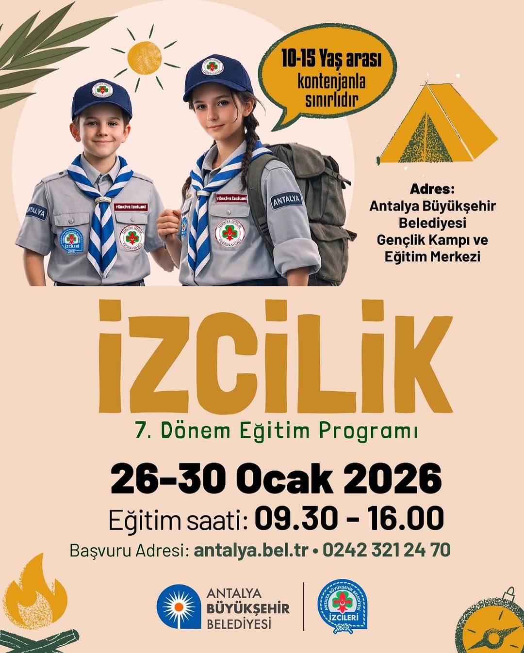 Beş gün sürecek olan İzcilik 7. Dönem Eğitim Programı, Antalya Büyükşehir Belediyesi Gençlik Kampı ve Eğitim Merkezi'nde yapılacak. Eğitimler her gün 09.30 ile 16.00 saatleri arasında gerçekleştirilecek. Katılımın ücretsiz olduğu program için kontenjan sınırlıdır.